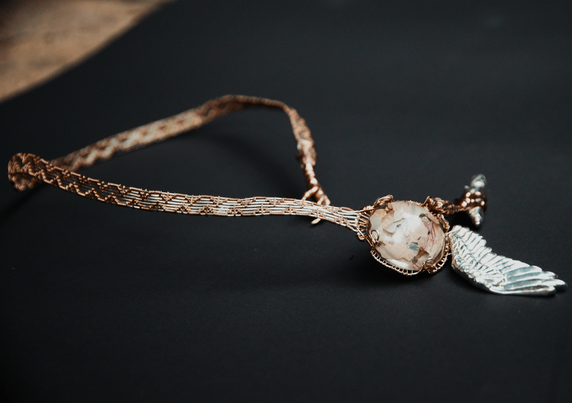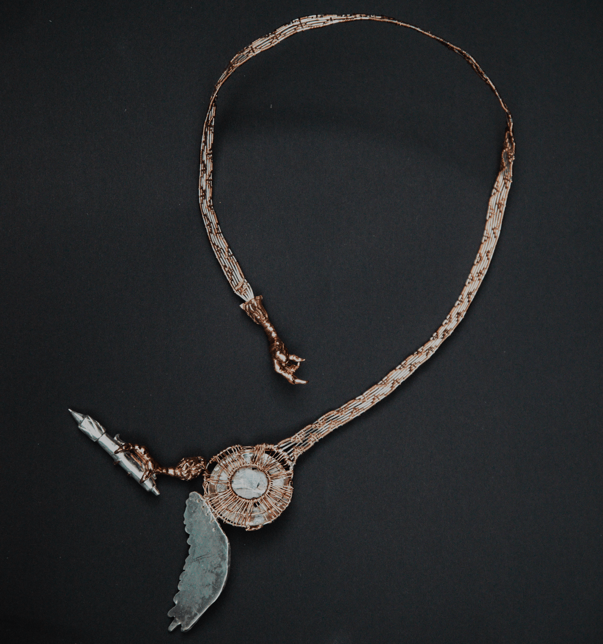 Hand woven copper and silver wire, hand carved wax cast in copper with silver plating, hand cast epoxy resin stone with banknote inserts.
