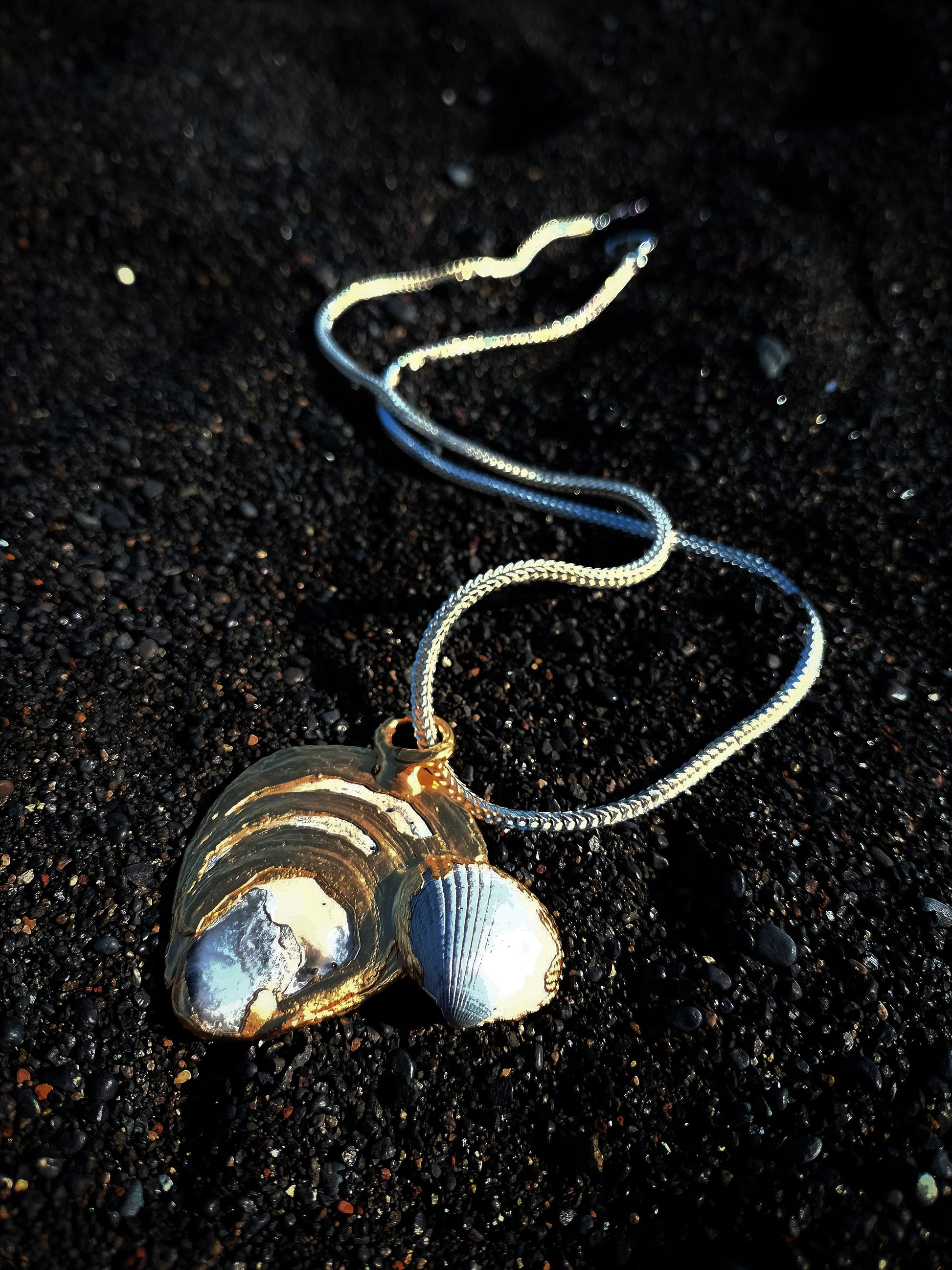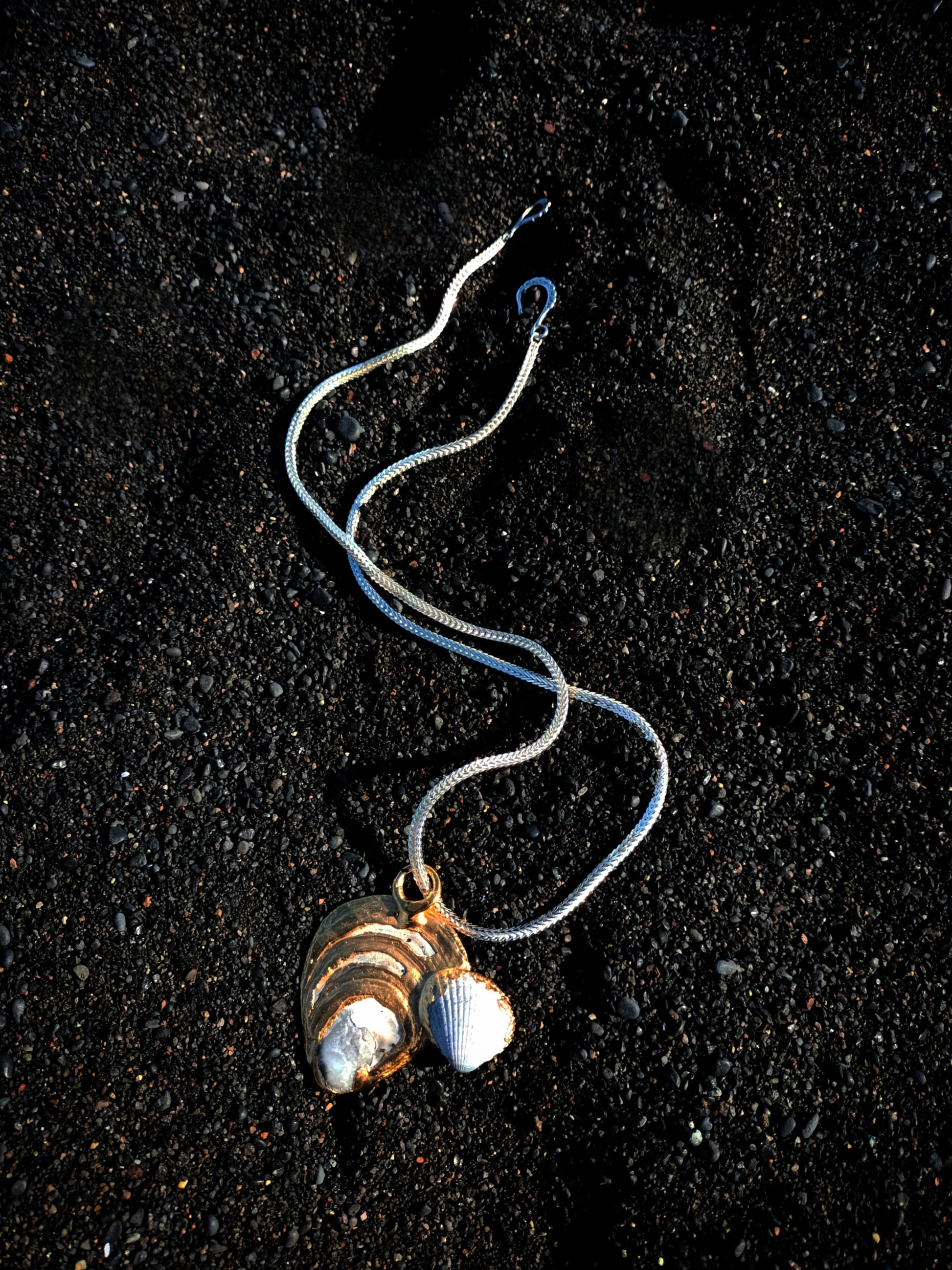 Oyster and clam shells electroformed in pure silver, with sterling silver foxtail chain and 24k yellow gold plating.