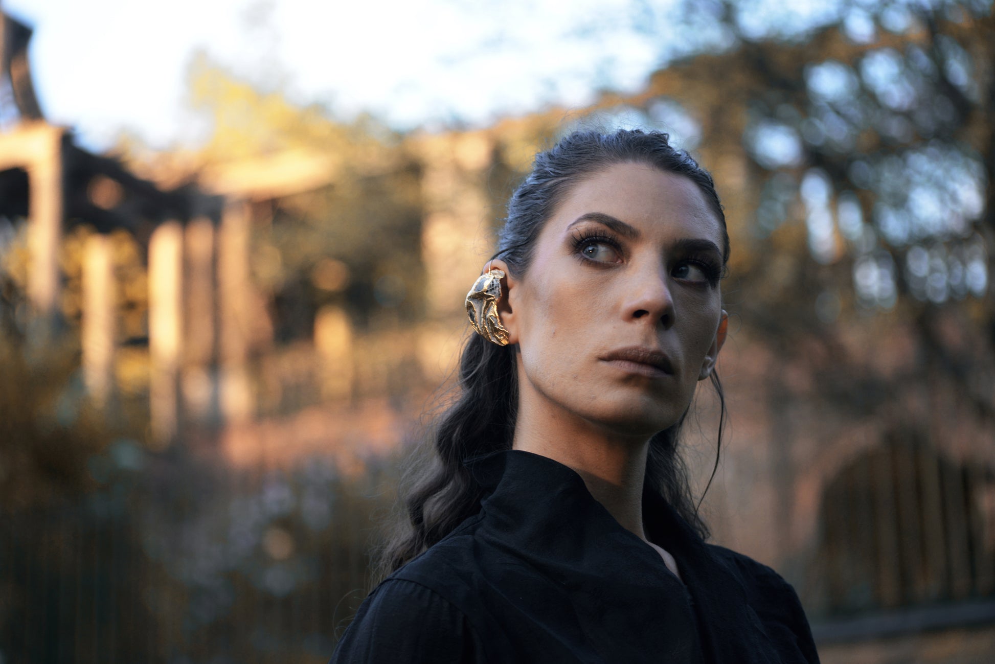 The statement earring is held in place by a classic earring post with butterfly back at the bottom, and an adjustable hook at the top. Wearing it only requires one regular ear piercing, and the top hook can be altered to fit different sized ears. This structure facilitates comfortable and practical wearing that suits a wide range of wearers.