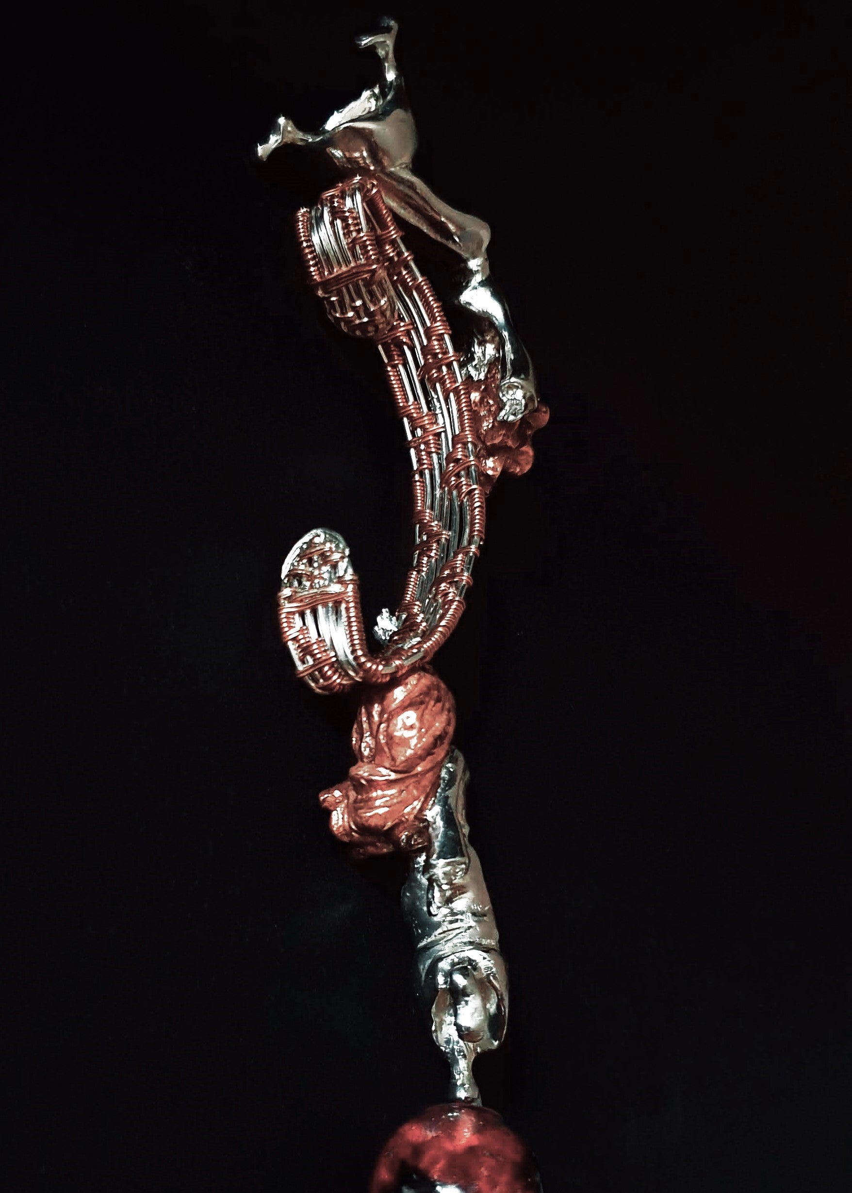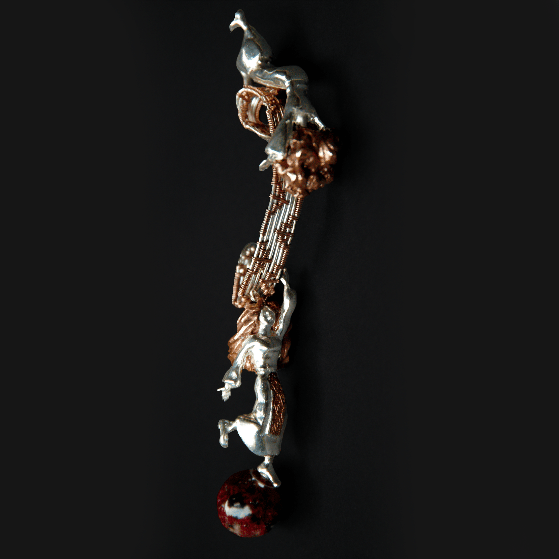 Hand carved wax cast in copper with sterling silver plating, hand woven copper and silver wire, hand cast epoxy resin with friendship bracelet insert.
